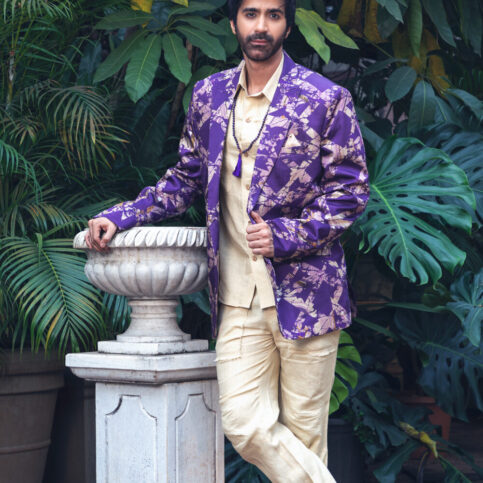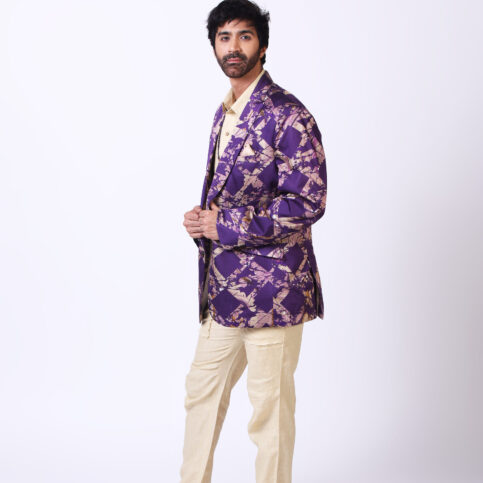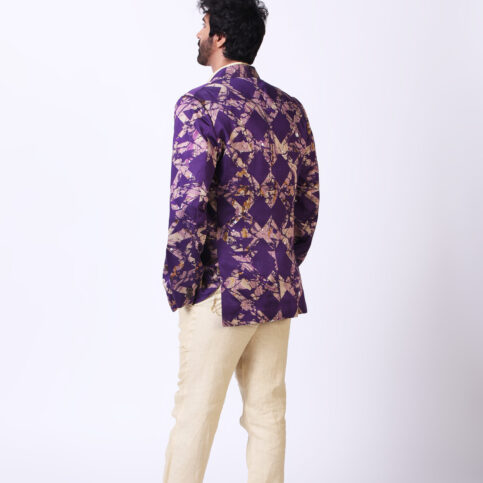 Ajrak print on marble modal satin high lapel tuxedo cut jacket with piped edge gusset, flap pockets, coordinated buttons & lined in jacquard satin. This item is a soft & elegant fashion statement jacket which can be easily dressed up or down for any occasions.