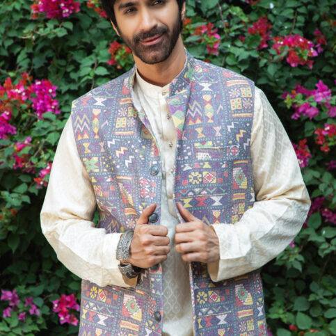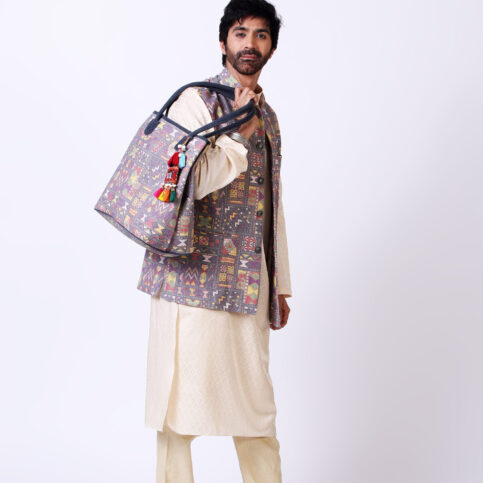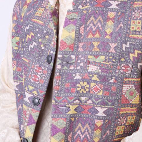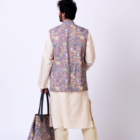 Banjara gipsy printed cotton canvas sleeveless Nehru collar coaty with fancy buttons & lined in jacquard satin. This item is a statement of Indian elegance easy to be coordinated with many items in our collections including our knits & worn on many occasions like lounge, travel, cruise, city, work or festive.