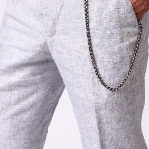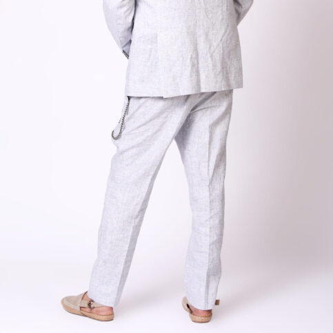 Casement linen suiting unlined cigarette trouser with vent pockets & coconut buttons, a perfect summer’s trouser to wear on resort, cruise, city, or formal occasions.