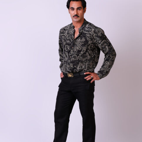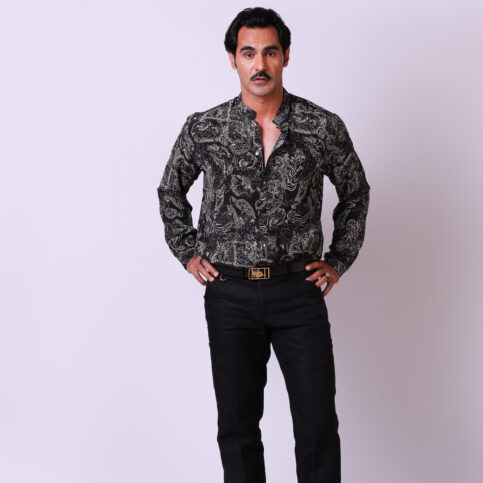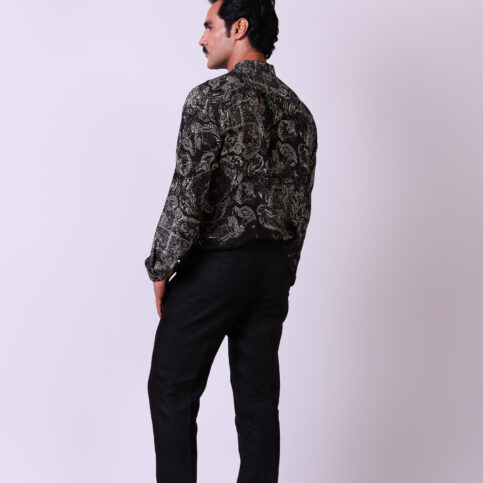 Paisley print on pure silk crepe de chine, long sleeve band collar shirt. This item is easy to coordinate with many items in our collection & can be worn for occasions of lounge, cruise, resort, city, party & festive.