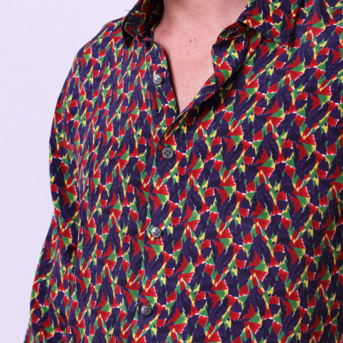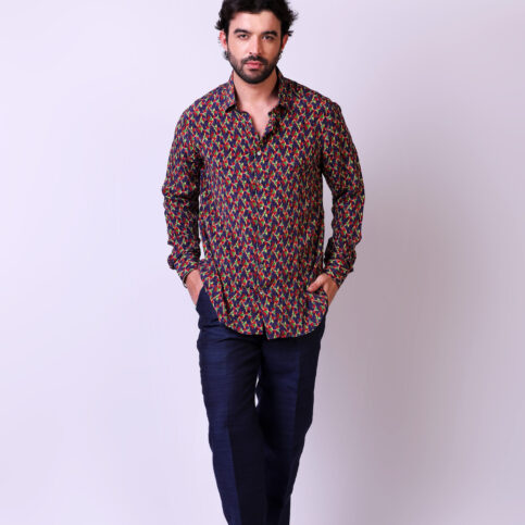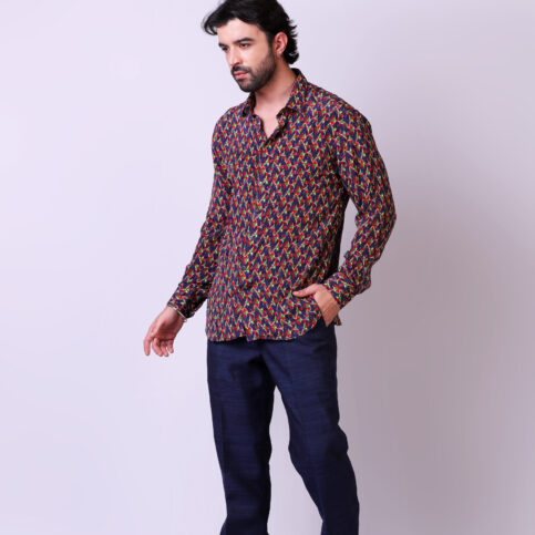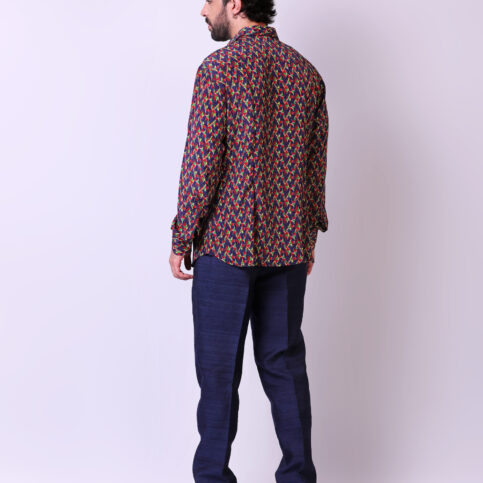 Retro geometric print on pure silk crepe de chine, long sleeve classic collar shirt. This item is easy to coordinate with many items in our collection & can be worn for occasions of lounge, cruise, resort, city, party & festive.