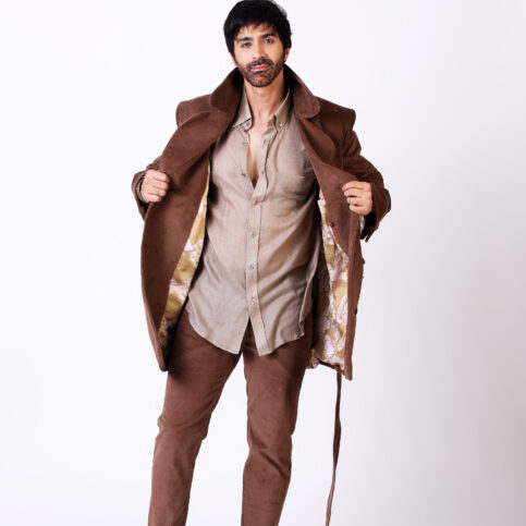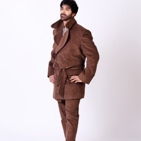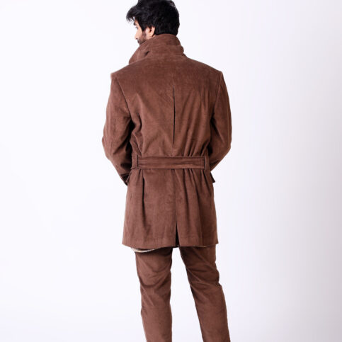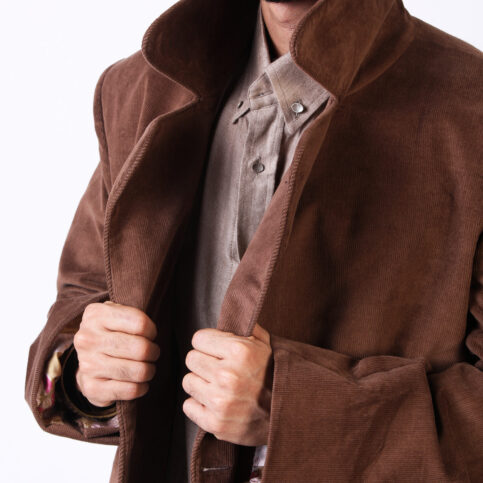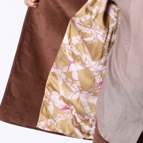 Cotton corduroy velvet double breast cut collar kimono Trench jacket lined in chintz printed cotton muslin & with metallic buttons. An extremely sharp, elegant jacket easily worn for city, travel, or party occasions.