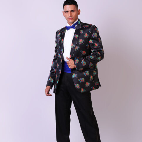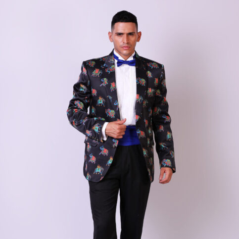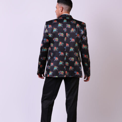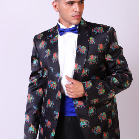 Indian adorned elephant print on satin silk high lapel tuxedo cut jacket with piped edge gusset, flap pockets, coordinated buttons & lined in jacquard satin. This item is a soft & elegant fashion statement jacket which can be easily dressed up or down for any occasions.