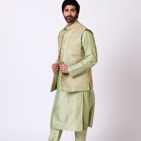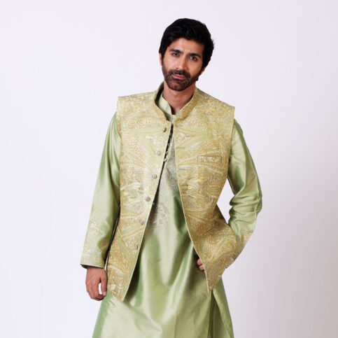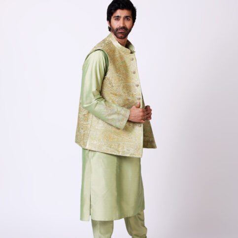 Gilded gold filigree Moghal embroidered on blended spun silk sleeveless guru collar coti self lined plain. This item is a prime sample of Indian Elegance to be worn for occasions of party, festive, trousseau & formal wear.