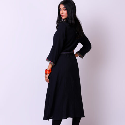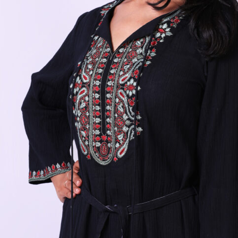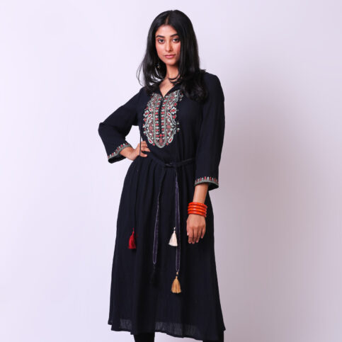 Fine placement embroidered cotton cheese cloth kurta tunic with tie belt and tassel embellishment, an elegant item easily worn even as a dress for lounge, cruise, city & festive occasions.