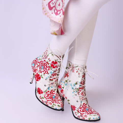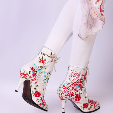 Featuring a pair of handcrafted stiletto boots in embroidered textile and with embellishments and 4 inch heel.