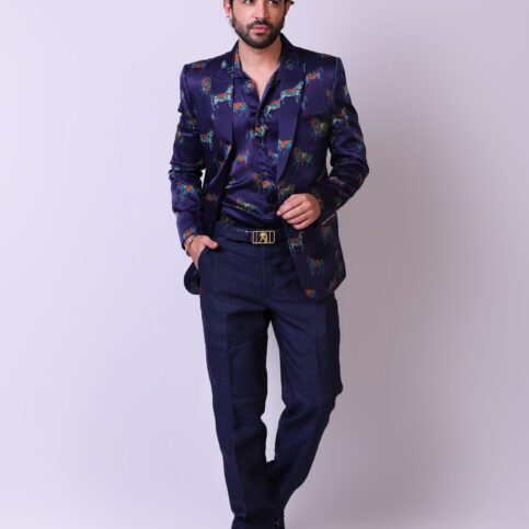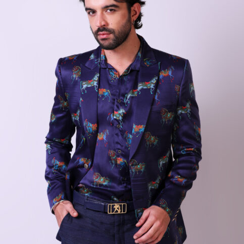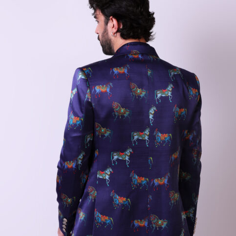 Indian adorned horse print on satin silk high lapel tuxedo cut jacket with piped edge gusset, flap pockets, coordinated buttons & lined in jacquard satin. This item is a soft & elegant fashion statement jacket which can be easily dressed up or down for any occasions.