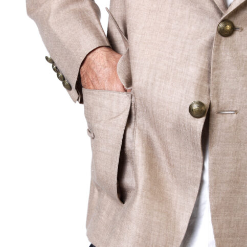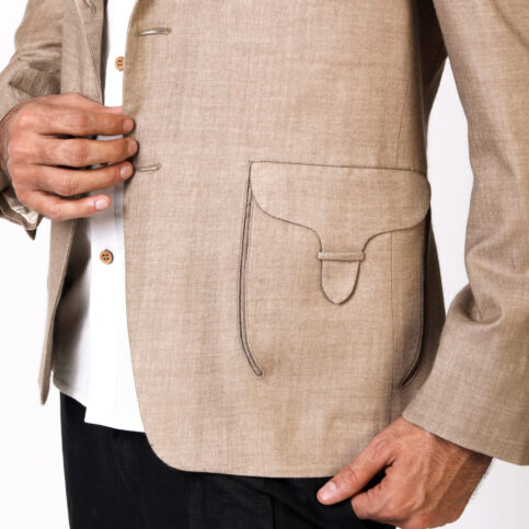 Fancy gusset & flap kashmiri fine wool shoulder blade collar cut jacket lined in satin with metal buttons. This item is a dignified jacket can easily be worn with many items in our collection & for occasions of city, work, travel, party or formal.