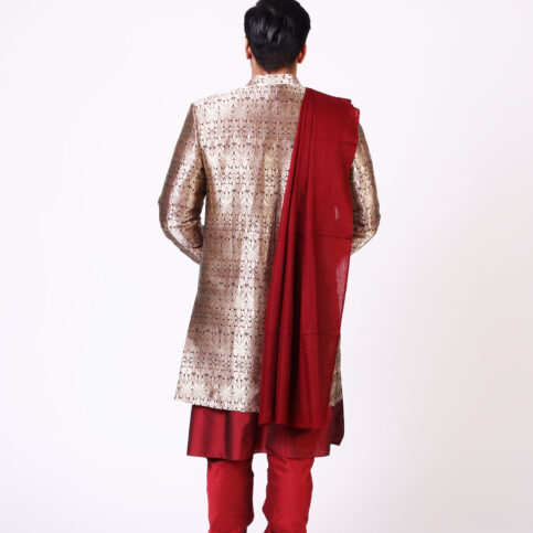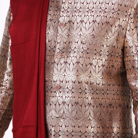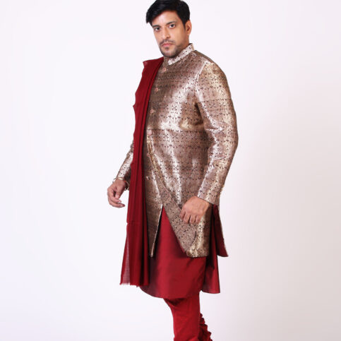 Handwoven Kinkabh silk brocade crossover short sherwani jacket, an Indian classic with coordinated precious buttons, lined in logo jacquard lining. This item is a defined item for festive, parties & formal occasions.