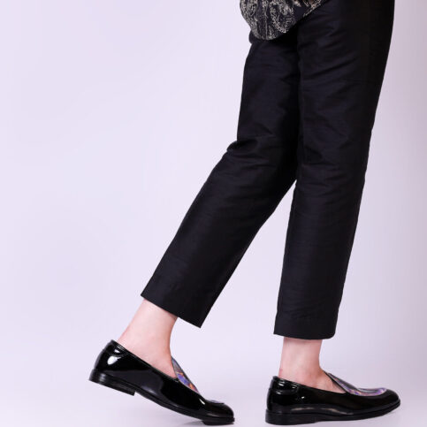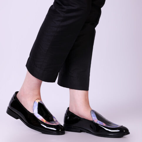 Featuring a pair of Black vegan leather shoes with inserts of lenticular sheet and 1 inch heel.