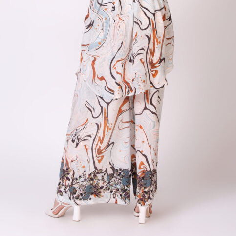 Return To ShopMarble & flora placement flared palazo pants in silk crepe de chine with elastic waist band, an extremely easy fit & elegant item for occasions of lounge, cruise, city & festive wear.