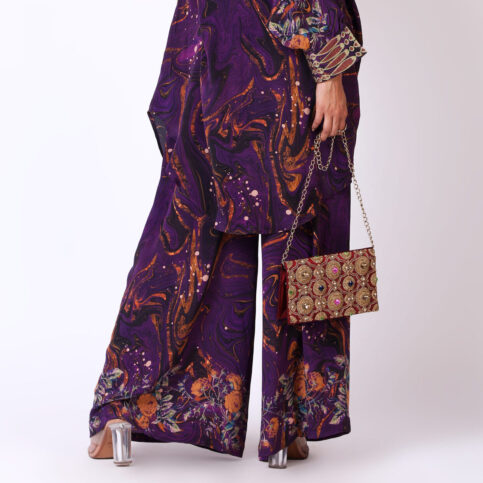 Marble & flora placement flared palazo pants in silk crepe de chine with elastic waist band, an extremely easy fit & elegant item for occasions of lounge, cruise, city & festive wear.