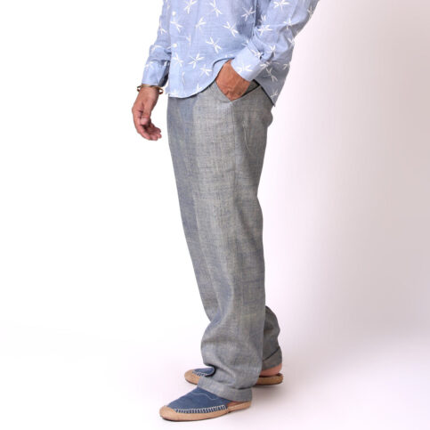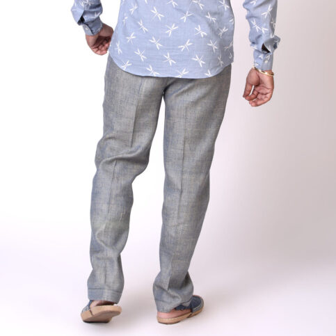 Handwoven casement refined raw silk classic front crease cigarette cut trouser with side seam vent pockets & lined in jacquard satin. This item is a clear smart trouser easy to coordinate with many items & best worn for city, work, festive or formal occasions.