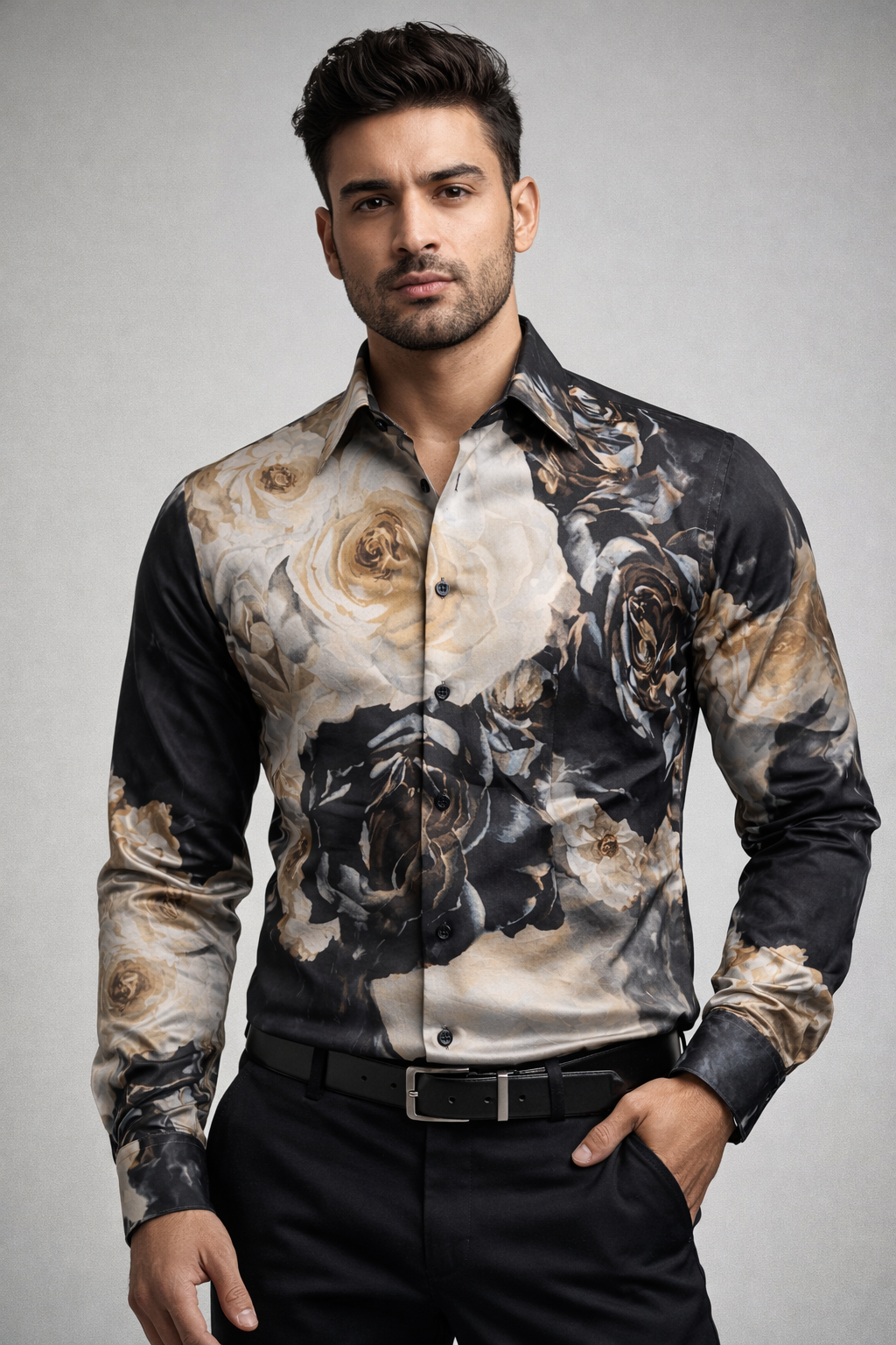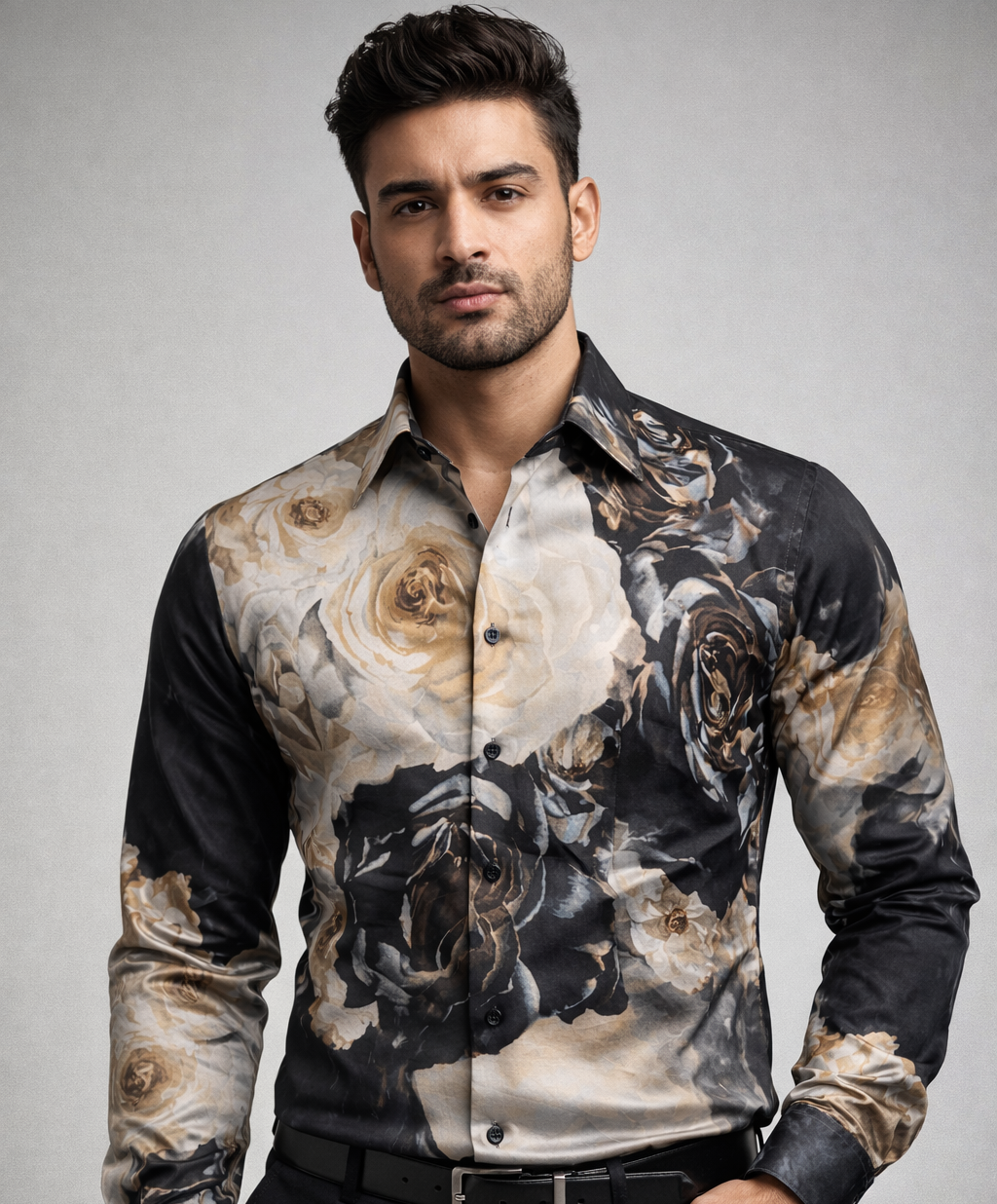 This shirt is a long sleve modal satin blended silk shirt printed with yin Yang roses , together with matching mother of pearl buttons makes an ideal elegant party & coctal item .