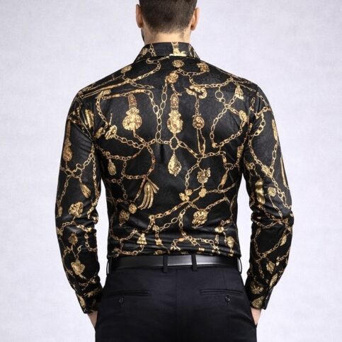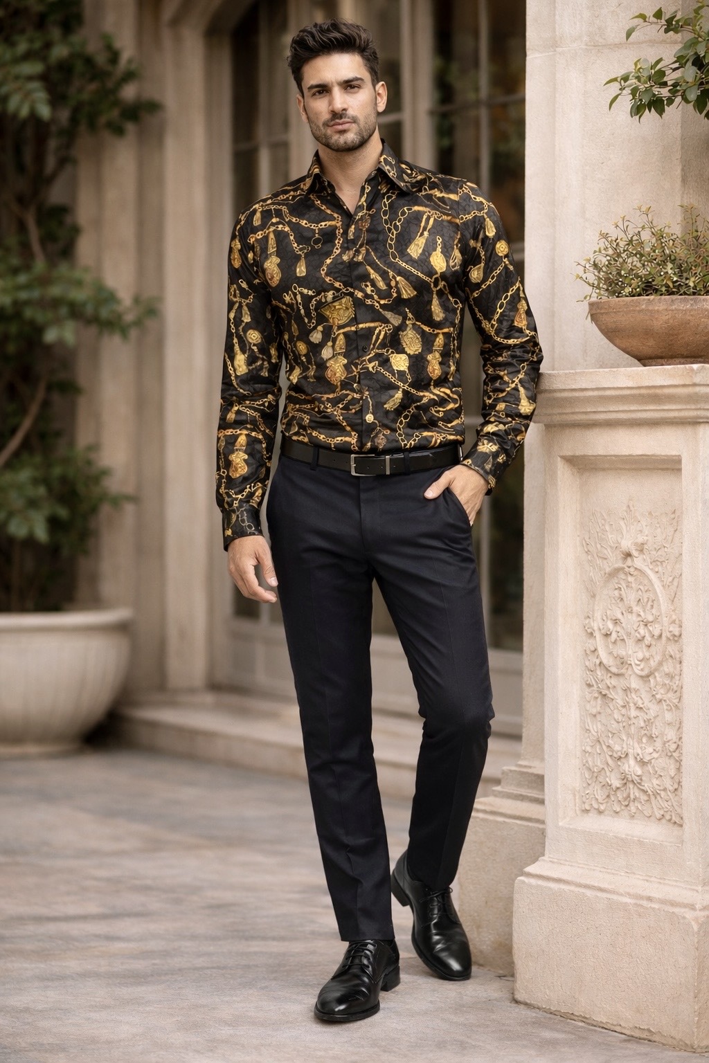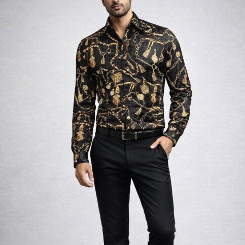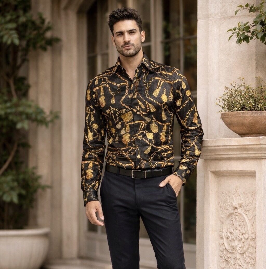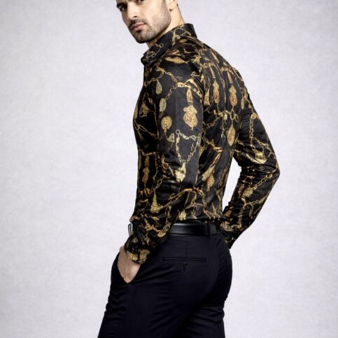 This shirt in fractal silk jacquard with chevalier print is a long sleeve classic elegant shirt ideally worn for occasions of cocktail & part .