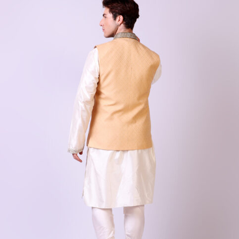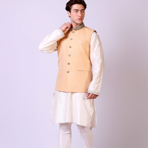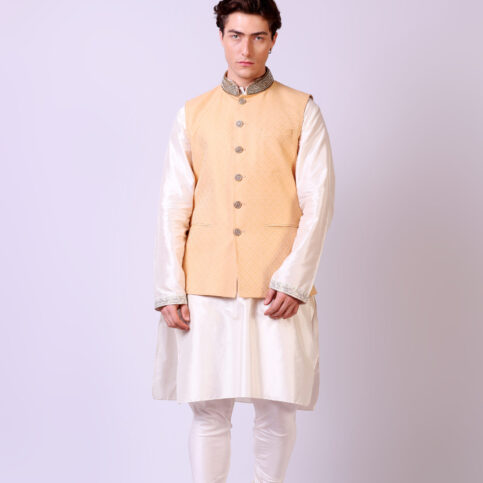 This item is made of handwoven Noil brocade silk with intricately hand embroidered collar. It is traditional in its look and can easily be worn over kurtas and shirts alike and is an elegant item for festive, party and formal occasions.