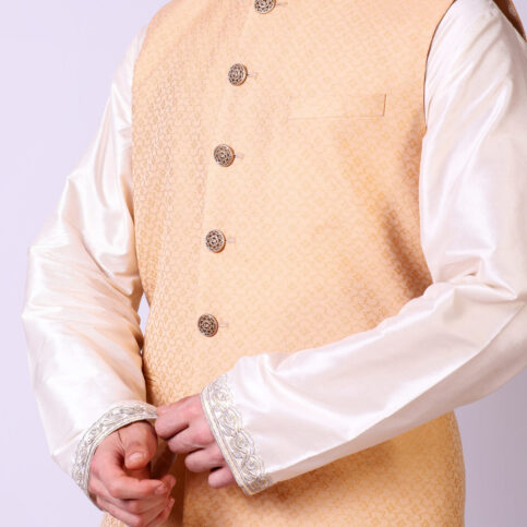 Blended Jacquard silk crossover short sherwani jacket, an Indian classic with coordinated precious buttons, lined in logo jacquard lining. This item is a defined item for festive, parties & formal occasions.