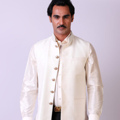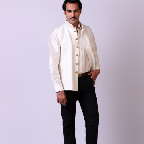 This item is made of handwoven matka silk with intricately hand embroidered collar. It is traditional in its look and can easily be worn over kurtas and shirts alike and is an elegant item for festive, party and formal occasions.