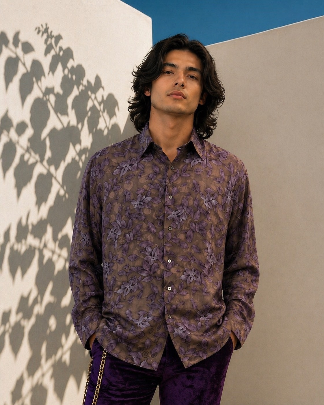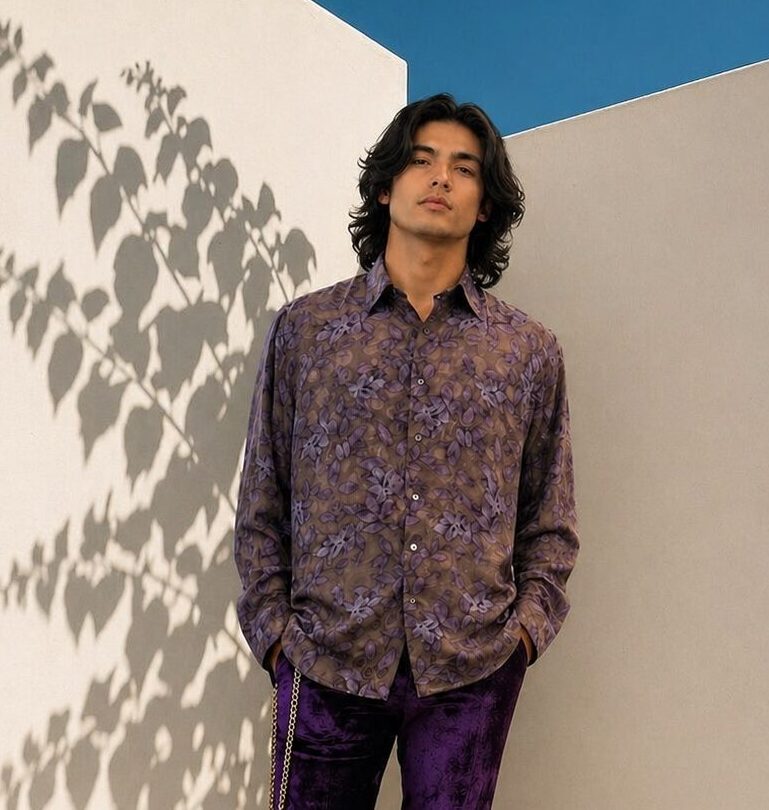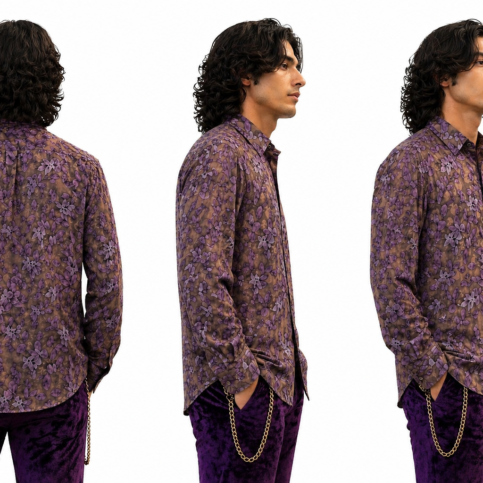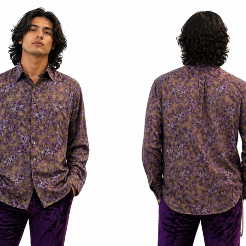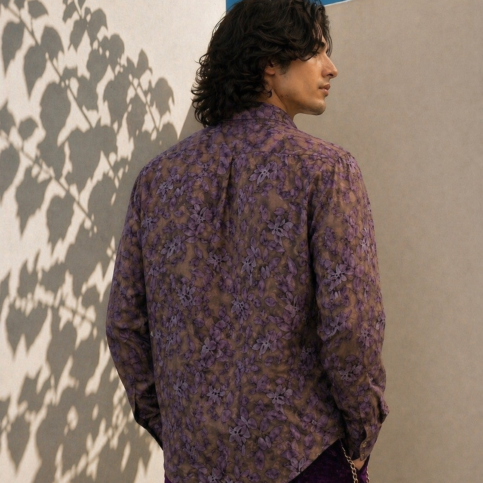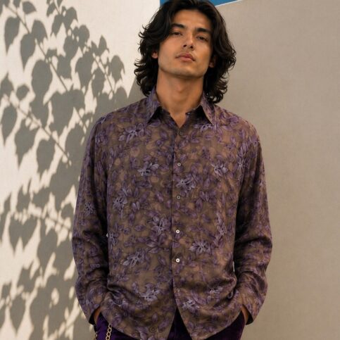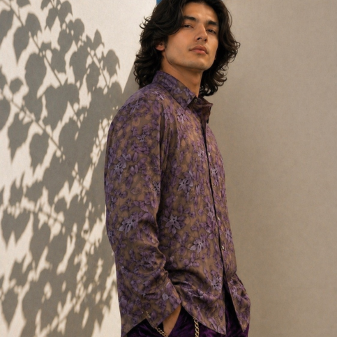 Mens polk satin silk jacquard shadow leaf print long sleve , collar band loop dress shirt , is an ideal elegant item for evening cocktail & party ware