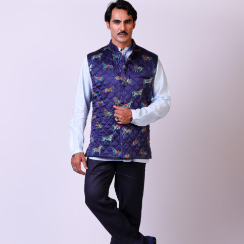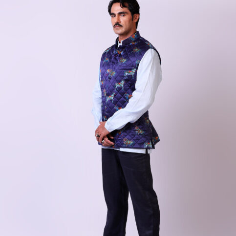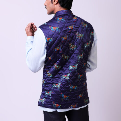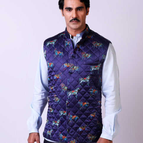 Indian adorned horse print on pure silk satin, diamond quilted guru collar sleeveless coti lined in satin logo jacquard & finished with crystal buttons. This item is easy to coordinate with many items in our collections & can be worn for occasions of lounge, cruise, resort, city, party & festive.
