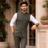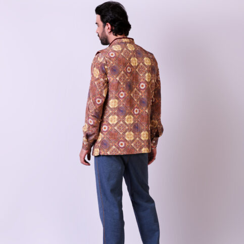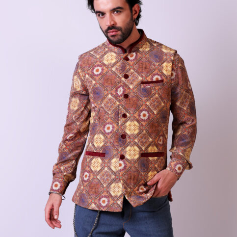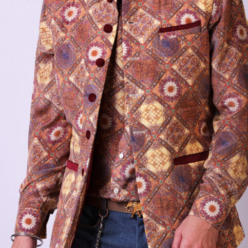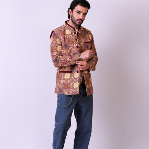 Contemporary persian print on pure crepe de chine silk, intricately quilted with velvet trim guru collar sleeveless coti lined in satin logo jacquard & finished with velvet buttons. This item is easy to coordinate with many items in our collections & can be worn for occasions of lounge, cruise, resort, city, party & festive.
