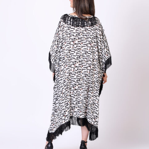 Shadow print modal satin with black fringe trim kaftan, a stylish & fun & elegant item for occasions of city, cocktail and festive.