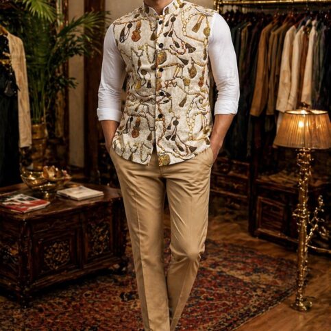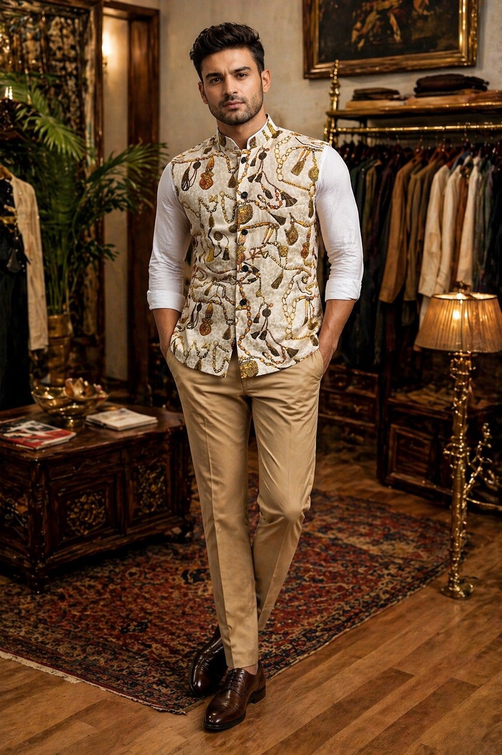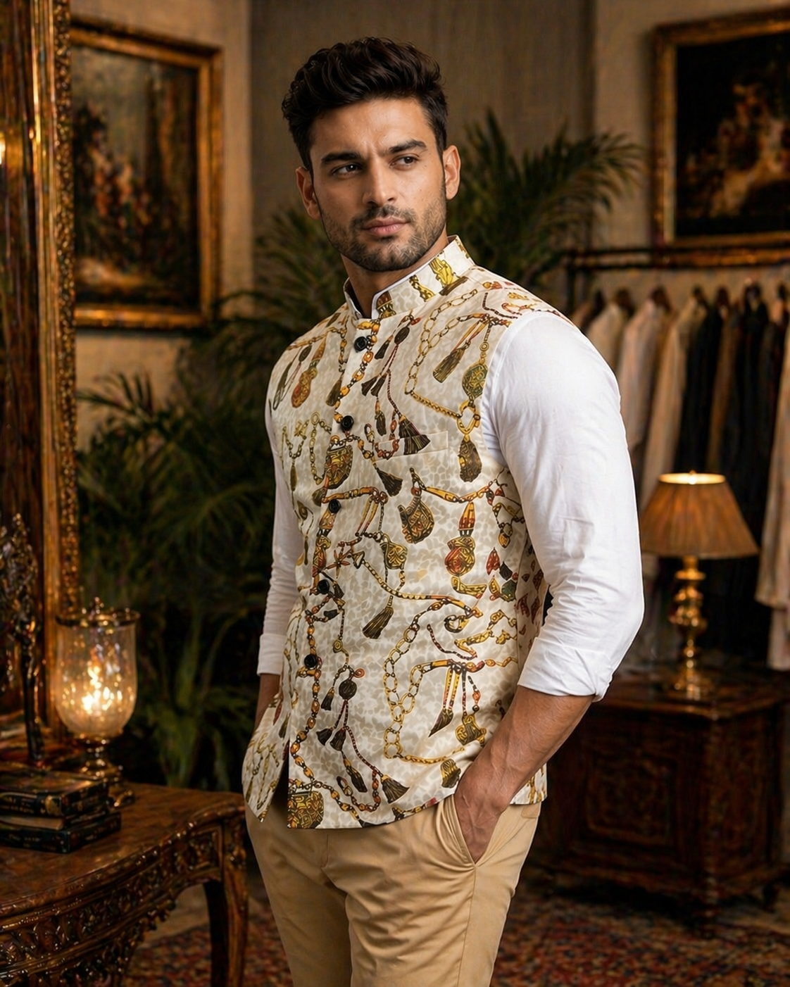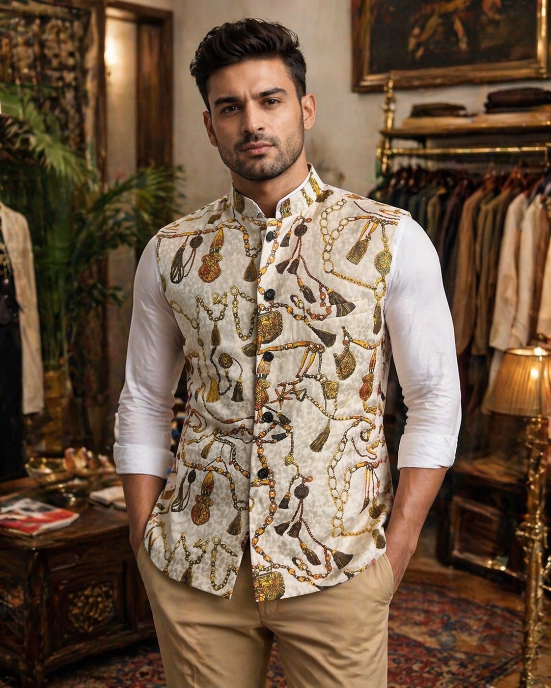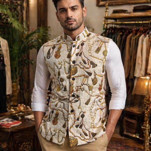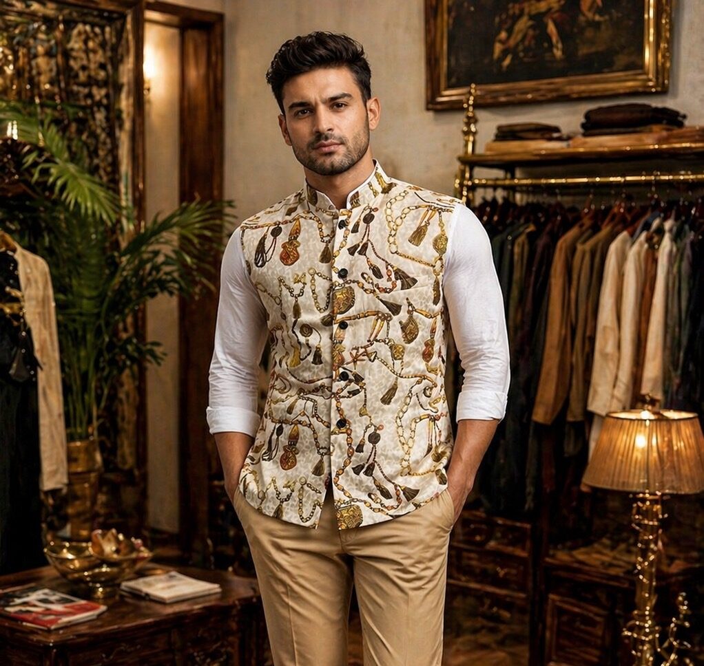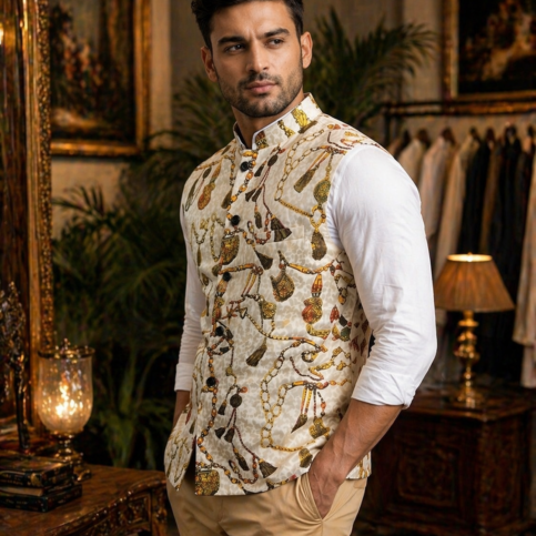 mens fractle satin silk jacquard with chevallier print , quilted sleeveless coti with metalic buttons & chest pockit .