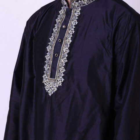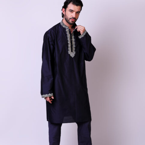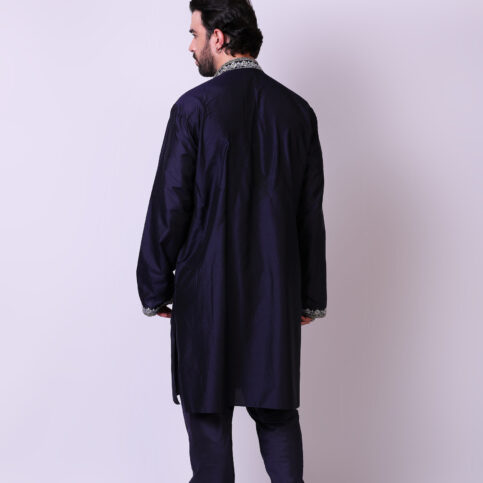 Pure spun silk guru collar, long sleeve kurta with intricate embroidery and jewelled buttons. This item of Indian elegance can easily be worn as is or coordinated with waistcoats & cotis or jackets in our collection & worn on occasions of lounge, cruise, city, party, festive & formal.