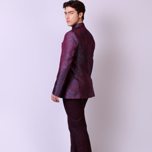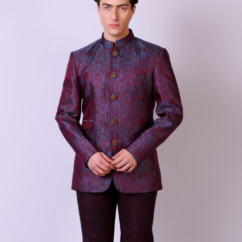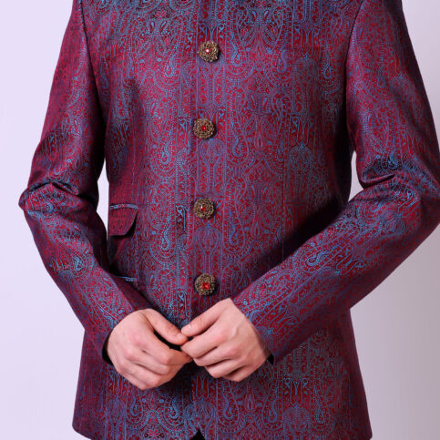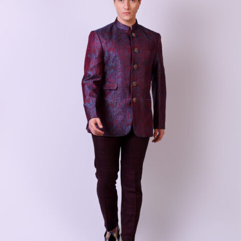 Handwoven resham tanchoi silk classic Nehru jacket with hand embroidered show buttons & flap pockets. This item is a clear classic of Indian elegance worn for occasions of city, festive or formal.