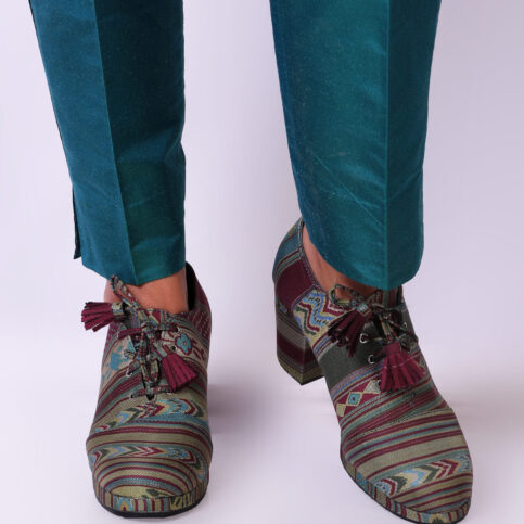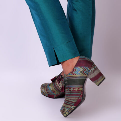 Featuring a pair of handcrafted block heel boots in tibetan stripe printed textile and with embellishments and 3 inch heel.