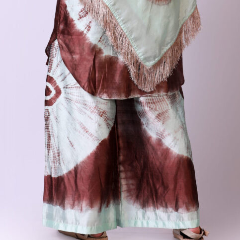 Hand Tie dyed flared palazo pants in tussar silk with elastic waist band, an extremely easy fit & elegant item for occasions of lounge, cruise, city & festive wear.