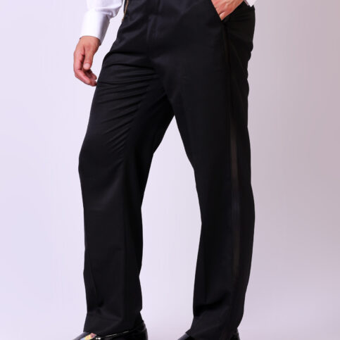 Blended wool classic flat front tuxedo trouser with side seam piped and vent pockets. This item is a classic clean cut trouser can be coordinated with many items in our collection & easily worn for almost any occasions like lounge, cruise, city, work, party, festive or formal.