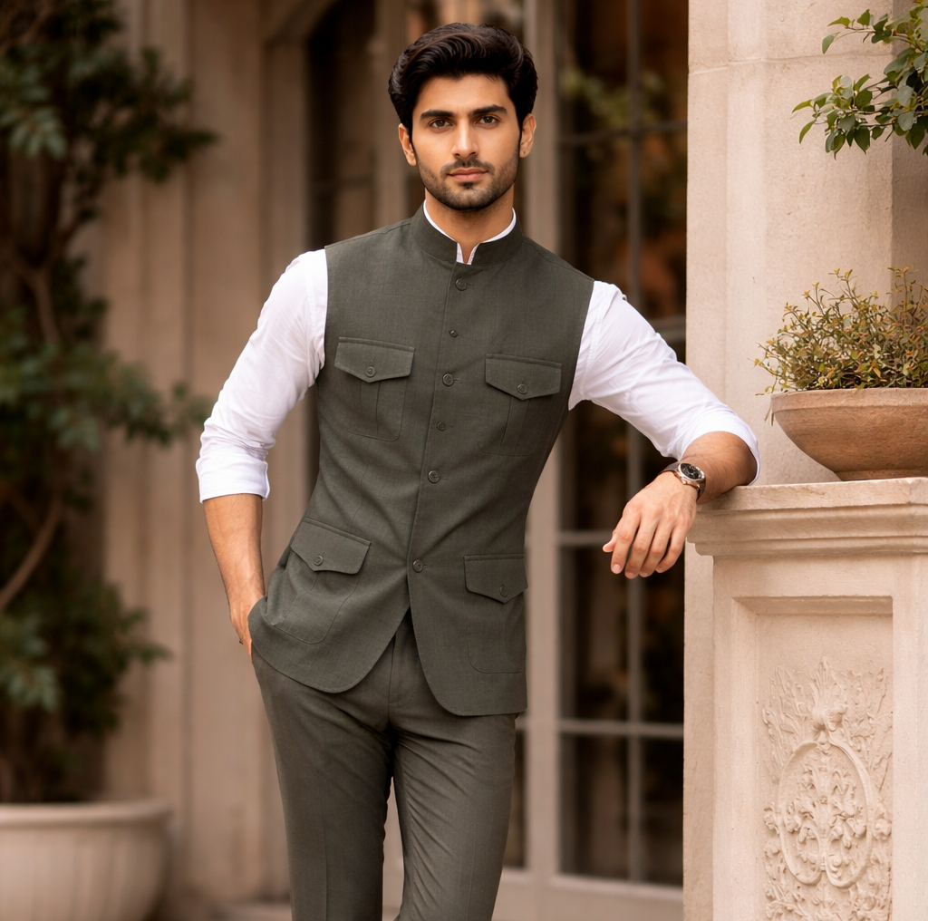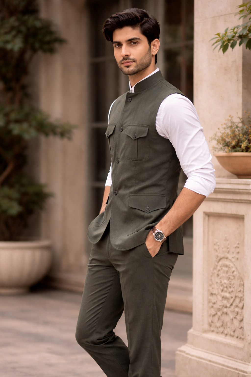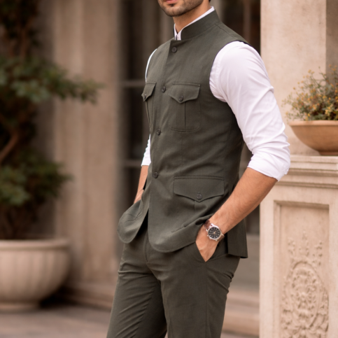 This is a 4 pocket & flap sleeveless unlined means safari coti with self fabric buttons , an elegant item easily worn over a shirt or t shirt , light & fresh for the summer city , work or party ware